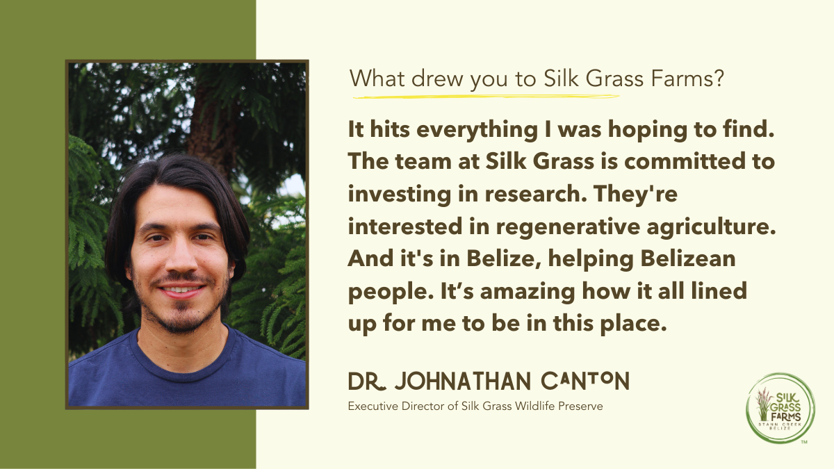 Silk Grass Farms is thrilled to welcome Dr. Johnathan Canton as Executive Director of the Silk Grass Wildlife Preserve. Born and raised in Belize, Johnathan has a Ph.D. in microbiology from the University of Florida and, prior to joining Silk Grass Farms, spent five years as a faculty member at the University of Calgary. Passionate about regenerative agriculture, Johnathan and his wife run an organic farm called Kunahmul, which means “love nest” in Mayan, on land in Belize that has been in Johnathan’s family for three generations.